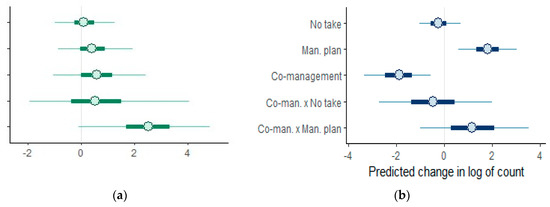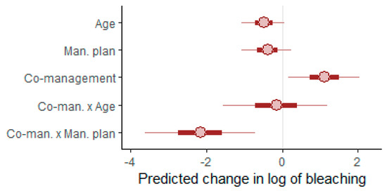 Figure 2 shows the point estimates and 95% credible intervals of interest for the model predicting coral bleaching. In accordance with the results of Gill et al. [26], MPAs that employ a formal governmental strategy (i.e., management plan) thereby indicating enhanced governmental efforts, show slightly lower levels of bleaching than MPAs which do not employ such strategies (β = −0.371).
