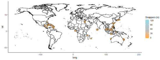 Both snappers (Lutjanidae) and groupers (Epinephelinae) are very much at risk to become overfished [46,47,48]. As such, their prevalence is a useful indicator for the well-being of the marine ecosystem in general and overfishing in particular. Figure 3 and Figure 4 map the 68 MPAs for which we were able to match management and conservation data.