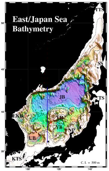 For the numerical simulation, we used the Research Institute for Applied Mechanics (RIAM) Ocean Model (RIAMOM; Lee []) developed at the Kyushu University, Japan. RIAMOM is a three-dimensional, z-coordinate, and primitive equation OGCM that assumes hydrostatic balance with the Boussinesq approximation. The model covers the entire East/Japan Sea (EJS) from longitude 126.5° E to 142.5° E and latitude 33° N to 52° N with 1/12° in horizontal resolution and 36 vertical levels (Figure 1). The bottom topography was extracted from a combination of two topographic datasets, ETOPO5 and SKKU []. Further details and validation of the RIAMOM used in this study can be found in Kim and Yoon [].
