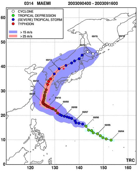 Best tracks of the Super Typhoon Maemi in September 2003 obtained from the Typhoon Research Center, Korea [] (17 May 2020). The red star denotes the position of the site used for the analysis related to the near-inertial motions in Figures 7–9.