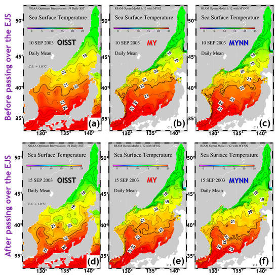 Sea surface temperature horizontal distributions obtained from (a,d) Optimum Interpolation Sea Surface Temperature (OISST) and simulated using (b,e) Mellor–Yamada (MY) model and (c,f) Mellor–Yamada–Nakanishi–Niino (MYNN) model before (top row) and after (bottom row) Typhoon Maemi. The thick contour line in each panel indicates a 22 °C isotherm. The contour interval is 1 °C.