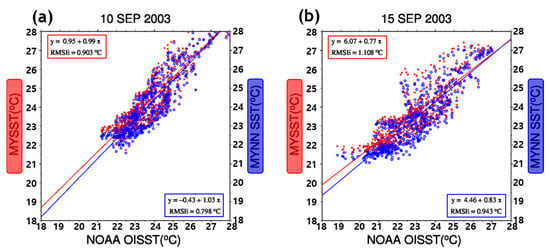 Scatter diagram between the sea surface temperatures (SSTs) south of 40° N obtained from satellite data and simulated using the Mellor–Yamada (MY) (red dots and line) and the Mellor–Yamada–Nakanishi–Niino (MYNN) (blue dots and line) models (a) before and (b) after Typhoon Maemi. (RMSE, root mean square error).