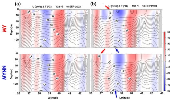 Vertical distribution of the temperature (contours) and zonal velocity (color-shaded) values calculated using the Mellor–Yamada (MY) (top row) and the Mellor–Yamada–Nakanishi–Niino (MYNN) (bottom row) models (a) before and (b) after Typhoon Maemi along the 133° E line (indicated by the solid blue line in Figure 1). The red arrow indicates the southward movement of the 22.5 °C isotherm in the upper layer and the blue arrow displays a rising of the 10 °C isotherm to a depth of 100 m. The solid contour line interval indicates 1 °C, and the dashed contour line interval indicates 0.5 °C.