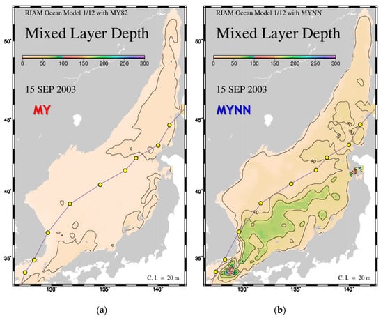 Horizontal distributions of the mixed layer depth calculated using (a) the Mellor–Yamada (MY) and (b) the Mellor–Yamada–Nakanishi–Niino (MYNN) models on September 15, 2003. The solid purple lines with yellow circles show the track of Typhoon Maemi. The contour interval is 20 m. The bottom of the surface mixed layer is defined at the depth where the potential temperature becomes lower than that at the sea surface by 0.5 °C.