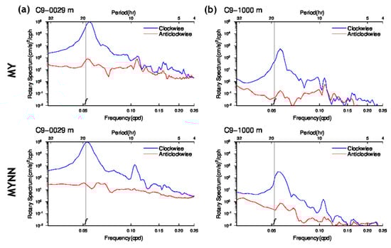 The temperature response in the upper layer to TCs is known to be largely the result of enhanced mixing associated with the near-inertial response to TC-related winds. TCs induce an energetic current with a strong inertial oscillation due to strong wind and wind vector rotation [,]. In addition, it is well known that there are significant near-inertial actions in the deep waters of the EJS []. Therefore, we need to better diagnose the vertical mixing induced by the near-inertial response in this region. Near-inertial internal waves triggered by TCs play an important role that drives turbulent mixing in the thermocline and ocean interior. A comparison of the near-inertial oscillations simulated by each turbulence model is shown in Figure 7. The figure shows the rotary spectra of the current velocity simulated by the MY and the MYNN model at depths of 29 and 1000 m at 133°40.7′ E, 38°40.0′ N (denoted by the red star in Figure 1 and Figure 2). The rotary spectra calculated from both simulations showed that the near-inertial peak in the clockwise components is prominent at all depths, indicating that the peak frequency of the motion is slightly larger than the local inertial frequency, . Interestingly, the super-inertial peak at around can be clearly observed in the result obtained using the MYNN model. These peaks at around have also been reported by Mori et al. [], who found a general description of the near-inertial oscillations in the EJS by analyzing the observed current data. In addition, Niwa and Hibiya [] reported that the double-inertial frequency waves emerged in the deep ocean interior at mid-latitudes. The existence of super-inertial waves is important because this super-inertial wave observed at around is believed to play a significant role in transferring energy to the internal wave field in the deep ocean and intensifies diapycnal mixing [,].