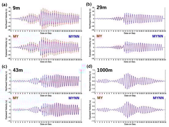 Time evolutions of the band-pass-filtered velocity simulated by the Mellor–Yamada (MY) (solid red line) and the Mellor–Yamada–Nakanishi–Niino (MYNN) (solid blue line) models at depths of (a) 9, (b) 29, (c) 43, and (d) 1000 m at a point of 133°40.7′ E, 38°40.0′ N (denoted by the red star in Figure 1 and Figure 2). The top row in each panel is the meridional velocity, and the bottom row in each panel is the zonal velocity.