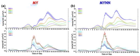 TC-induced winds generate intense kinetic energy in the upper ocean. The TC-generated kinetic energy is mostly consumed by vertical mixing between the surface warm water and the thermocline [], but some of the kinetic energy input radiates into the ocean interior in the form of near-inertial internal waves []. The time evolutions of the band-pass filtered velocity and the near-inertial kinetic energy obtained using both simulations are shown in Figure 8 and Figure 9, respectively. The cutoff of the band-pass filter is ± 1.75 h from the inertial period at the site. The near-inertial component of the velocity at the surface layer obtained using the MY model was stronger than that obtained using the MYNN model. However, the MYNN simulated a stronger increase in the near-inertial currents at all depths except the surface. In the MYNN model, the depth of the mixed layer is thicker and the horizontal convergence in the layer increases with the depth of the mixed layer, and the lead-direct current becomes stronger. During both simulations, as the typhoon approaches, the near-inertial kinetic energy begins to increase in the upper layer from 8 September and then rises strongly after the typhoon impact from September 12. However, the pattern of increase in the near-inertial kinetic energy differs between the two simulations. The near-inertial kinetic energy simulated in the MYNN model increased dramatically at all depths when the typhoon reached the site (13 September).
