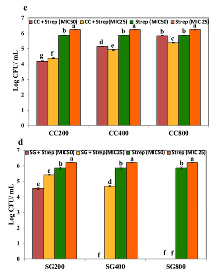 Combined effects of antibiotics and seaweed extracts (SWE) on S. Enteritidis. Tetracycline (Tetr) and streptomycin (Strep) at MIC50 and MIC25 were tested in combination with seaweeds Chondrus crispus (CC) and Sarcodiotheca gaudichaudii (SG) at three different concentrations (200, 400 and 800 μg/mL) (a) CC and Tetr; (b) SG and Tetr; (c) CC and streptomycin (Strep); (d) SG and Strep. Values with different superscript letters were significantly different (p < 0.05). Values represented mean ± standard deviation from three independent experiments (n = 9).