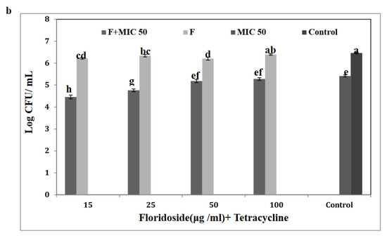 Synergistic interactions of floridoside and tetracycline (MIC25 and MIC50) were evaluated in-vitro using the liquid culture inhibition test, as described in above Section 2.4. Briefly, bacterial cells were grown in the presence of different combination of floridoside (15 µg/mL) + tetracycline (MIC25, 4 µg/mL), floridoside (15 µg/mL) + Tetracycline (MIC50, 7.9 µg/mL). Tetracycline (MIC25 and MIC50) and floridoside (15 µg/mL) were used as controls. Antimicrobial activity was determined as a measure of log CFU/mL.