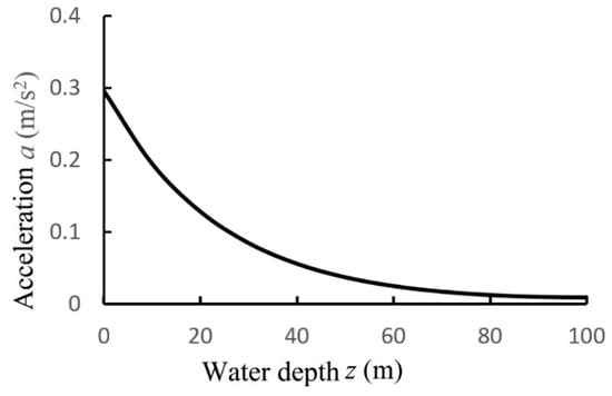 In order to facilitate the calculation, the waves are simplified and regular waves are used for calculation. The regular wave height is set at 1.5 m, the wave period is 10 s and the wavelength is 150 m. According to formulas (21)–(24), the velocity and acceleration of water quality points at different water depths can be obtained, as shown in Figure 2 and Figure 3. It can be seen from Figure 2 that under wave conditions, the maximum horizontal velocity of water quality points decreases with increasing water depth, and the maximum value is obtained at sea level. When the water depth exceeds half the wavelength, the maximum horizontal velocity of the water quality point is almost zero. As can be seen in Figure 3, the maximum horizontal acceleration of water quality points is consistent with the horizontal velocity in the vertical direction, and both decrease with increasing water depth. Therefore, it can be obtained that the wave force that the clamp is subjected to at the water surface position is the largest.