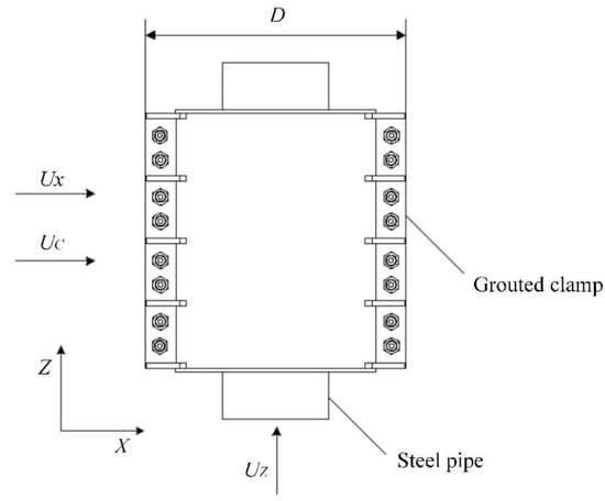 where, is the horizontal velocity of water quality point under the comprehensive action of wave and current, is the horizontal acceleration of water quality point under the comprehensive action of wave and current, is the drag force coefficient, is the inertia force coefficient [23], D is the outer diameter of grouting clamp and is the density of sea water.