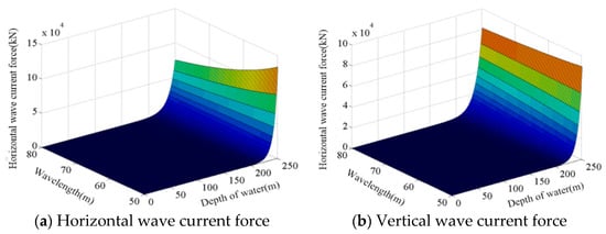 At this time, the horizontal wave current force of the clamp is greater than the vertical wave current force, and the horizontal wave current force formed by the direct impact of water quality points on the surface is greater than the lift force due to the pressure difference between the upper and lower. The change rule of Figure 10a,b below is consistent with Figure 10a,b. The maximum horizontal wave current force is 14.8 × 104 kN, and the maximum vertical wave current force is 9 × 104 kN. Between 230 m and 250 m, the wave current force decreases with the increase of wavelength.