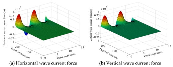 The following figure shows the change of horizontal wave current force with water depth and phase angle, and the change of vertical wave current force with water depth and phase angle. The change rule of Figure 9a,b above is consistent with that of Figure 3. The maximum horizontal wave current force (maximum radial force) of the clamp is 0.85 × 105 kN, and the maximum vertical wave current force (maximum lifting force) of the clamp is 7 × 104 kN.