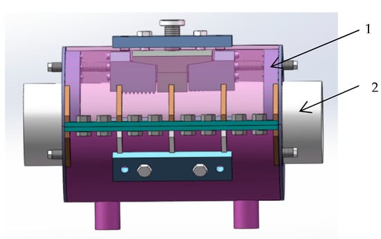 The grouting clamp used in this time is different from the traditional one, and a self-locking mechanism is used in the grouting ring [24,25,26]. The mechanism adopts inclined plane self-locking, uses dovetail groove as guide, and selects tooth shape surface at the bottom of wedge to contact with defective steel pipe to increase friction coefficient. The selection of grouting mechanical clamp not only retains the advantages of traditional grouting clamp, but also increases the self-locking performance. Even if the grouting material fails, the self-locking mechanism can ensure the safety of the grouting clamp, and the self-locking mechanism can increase the pre tightening force of the grouting clamp. The self-locking grouting clamp is shown in Figure 11, the part 1 is the clamp and part 2 is the damaged pipe [27].