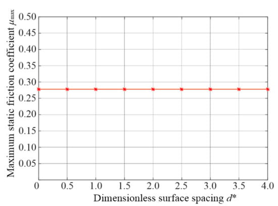 The complex Simpson method in MATLAB is used to get the numerical solution. The relationship between the maximum static friction coefficient and the distance is shown in Figure 12. It can be seen from Figure 12 that the maximum static friction coefficient of the contact surface between the bottom of the wedge block of the grouting clamp and the steel pipe does not change with the change of the distance between the micro convex bodies on the contact surface. Take the friction coefficient between the bottom of the grouting clamp wedge and the contact surface of the steel pipe.