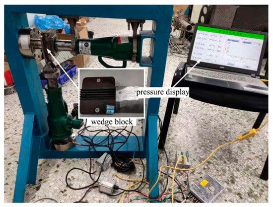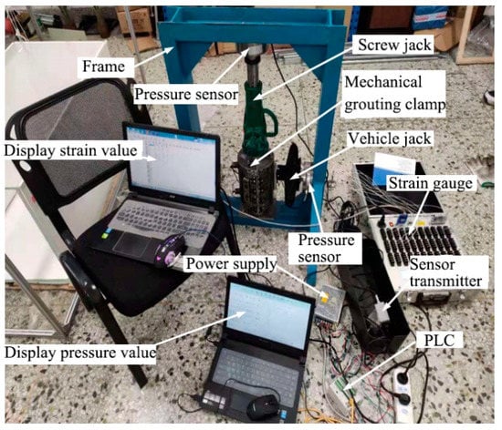 As shown in Figure 16 is the experimental platform, the grouting mechanical clamp is subject to the pressure from the axial and radial jacks, respectively. As a result that the clamp will be subjected to a large axial force, the design of the frame cannot be too wide, or it will lead to a large deformation, which will affect the test results. On this basis, the length of the jack applied laterally cannot be too large, so the car jack is selected to apply a radial force to the clamp [29,30].