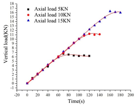 As shown in Figure 14, the longitudinal load will be different under different axial loads. The experimental process is divided into three groups. Under a certain transverse load, the longitudinal load is applied to the steel plate and the recorded data are in Table 2.