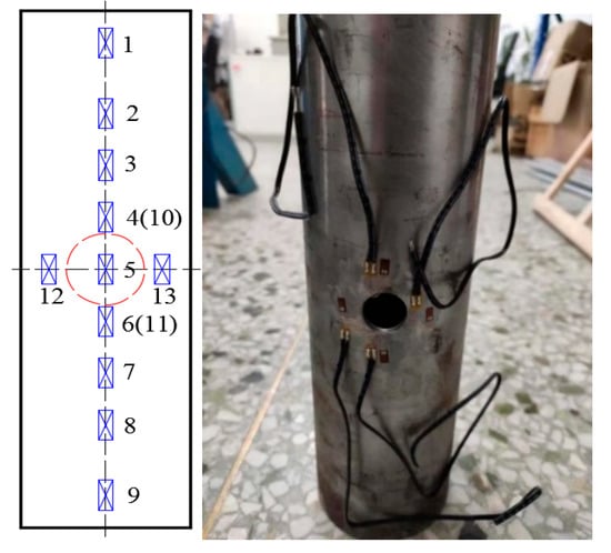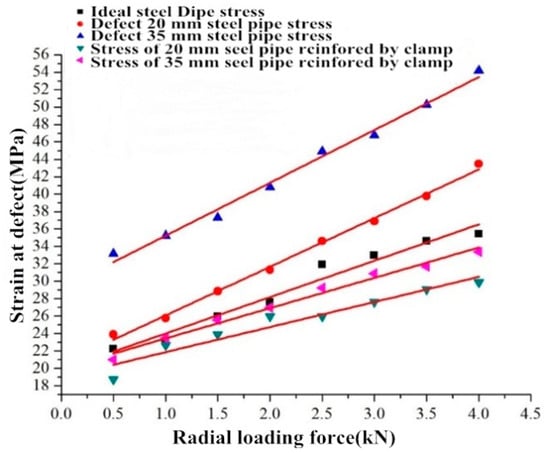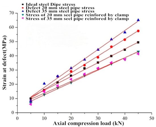 As shown in Figure 19, the change of the strain value at the 13th measurement point on the steel pipe shows that the stress of the defective steel pipe in the radial position (dangerous area) of the defect is significantly greater than that of the ideal steel pipe in the same position, and the stress value increases as the defect increases. The larger it is, the more the surface defects will affect the safety performances of the steel pipe. This conclusion is consistent with the actual situation. When the defective steel pipe is reinforced, the stress at the measuring point of the defective steel pipe is significantly reduced and both are less than the stress of the ideal steel pipe at the same location, indicating that the grouting mechanical clamp can effectively strengthen the defect.