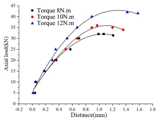 The slip force is 32 KN, 36 kN and 44 kN when the torque is 11 N∙m, 13 N∙m and 15 N∙m. According to Table 3, the equivalent friction coefficient is 0.44, 0.42 and 0.44. The axial force variation under different torques is shown in Figure 20.