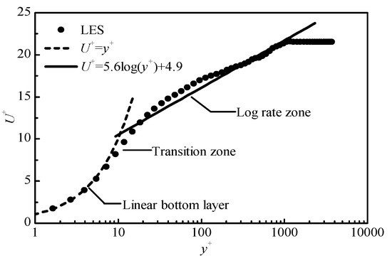 The parameters for mesh and simulation are determined based on the following two constraints. On the one hand, it is necessary to ensure that there are enough turbulence structures, including streaks and streamwise vortices, in the calculation domain to meet the research requirements. The size of a streak can be estimated by the average length of , the average height of , and the average span spacing of . The size of a streamwise vortex can be estimated by the average length of , and the average vertical height of , where is the kinematic viscosity and is the wall friction velocity [36]. On the other hand, LES requires , and for the mesh and a courant number less than 0.5 [37].