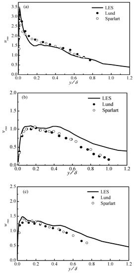 The velocity distribution (as shown in Figure 3) is obtained by extracting and ensemble averaging the velocity data in the flow field after 20 mm downstream from the obstacle line. The aim of this process is to avoid the influence of the obstacle line. The parameters in Figure 3 are dimensionless. As the figure shows, the distribution of average velocity of the turbulent boundary layer has three typical regions: the linear bottom layer, the transitional region, and the log-rate region. The calculated results are in good agreement with the theoretical values [41,42] in both the linear bottom and logarithmic regions. The fluctuation intensity (as shown in Figure 4) is the root mean square of fluctuation velocity and can reflect the intensity of turbulence. As the figure also shows, the peak value of the fluctuation intensity occurs at a position of about , and then it rapidly drops, decreasing to 0 at the edge of the boundary layer. Comparing the fluctuation intensity with the DNS results of Lund [43] and Spalart [44], it can be found that the results agree well in all three directions.