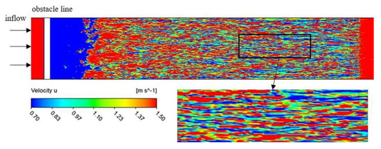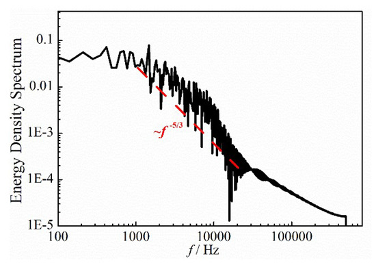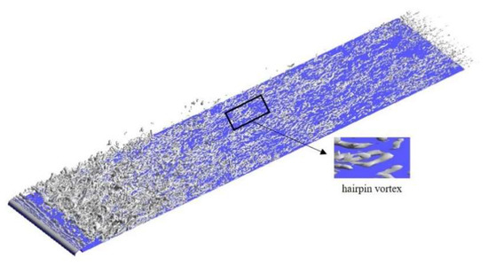 In a turbulent boundary layer, the energy is transferred from the mean flow to the fluctuation flow. Large eddies are generated by mean flow and gain energy from it. Then, the energy is transferred from large eddies to smaller eddies until the eddies are small enough in size and the energy is dissipated when the viscous forces dominate. This process is a classic energy cascade [45]. The energy spectrum shown in Figure 5 shows the energy cascade in the turbulent boundary layer. The largest eddies (lowest frequencies) on the left side of the spectrum gain energy from the mean flow and the energy cascades down to smaller eddies (larger frequencies) until it is dissipated. The streaks (as shown in Figure 6) are the streamwise distribution of high and low velocities occurring near the wall surface, which are caused by streamwise vortices and are a typical feature of the flat-plate turbulent boundary layer. Figure 6 shows the velocity profile at ; it is clear that the fluid begins to form streaks after it has flowed some distance from the obstacle line. The streamwise and hairpin vortices (as shown in Figure 7) are also a typical feature of the flat-plate turbulent boundary layer. In this paper, the Q-criterion is used to extract the instantaneous vortex structure, as shown in Figure 7, where . The Q-criterion expression is:
