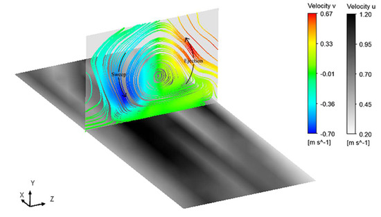 This represents the continuous balance of the shear strain rate and the vortex tensor, and it has a good performance in identifying vortex structures. Figure 8 shows the connection between the streaks and the streamwise vortices. It can be found that the streaks are caused by the streamwise vortices through sweep and ejection. The sweep is responsible for the increase of velocity near the wall, while ejection is responsible for the decrease. In a turbulent boundary layer, the head of the streamwise vortex would rise to the transition zone under certain conditions. At this zone it will vibrate and rupture, leading to intense fluid mixing and energy transport. In this process, a high-speed fluid will hit the wall, causing the velocity gradient near the wall to increase. These phenomena are reflected in the transition zone of the velocity distribution, in the peak of the turbulence intensity, in the gain of the energy spectrum, and the increase of frictional resistance. It is important for the method used in this study to obtain the above results, because the analysis will rely on the identification of these phenomena. From the occurrence of the burst to the increase of frictional resistance, it is a process in which various physical phenomena from micro to macro are interrelated. The most important ones among them are these we discussed above.