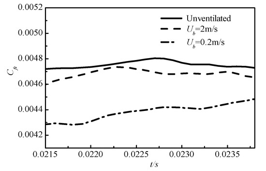 is the wall shear stress, and and are streamwise and spanwise lengths. Changes in the drag coefficient over time is shown in Figure 9. The drag decreases after microbubbles are introduced, and the drag reduction effect is inversely proportional to the velocity of the bubble jet. The time average of is shown in Equation (25), and the results obtained are shown in Table 2.