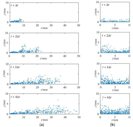 Projection of microbubble distribution on an x–y plane (a) and a z–y plane (b) at four different moments.