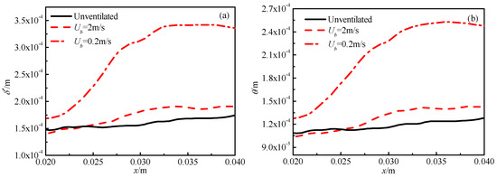 Streamwise variation in displacement thickness and momentum thickness of the boundary layer: (a) displacement thickness and (b) momentum thickness.