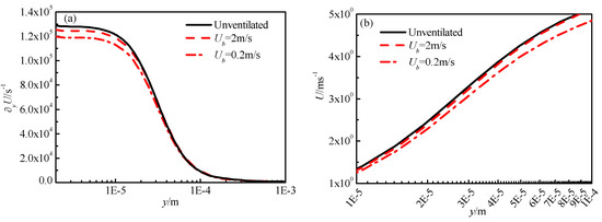 The effects of microbubbles on the TBL velocity distribution are shown in Figure 14. Panel (a) shows the distribution of the velocity gradient within the boundary layer. It can be seen that the velocity gradient at the wall is reduced after the injection of bubbles, which can explain the reduction in drag coefficient because the skin friction is determined by the velocity gradient at the wall. Furthermore, because the velocity of the wall is always zero, the velocity gradient is only related to the flow velocity near the wall. If the incoming velocity remains constant, the velocity near the wall is determined by the vortex structure and burst [36,37]. On the sweep side of the vortex, the fluid impacts the wall at high speed, increasing velocity at that point. Meanwhile, when the vortex breaks, that is, when a burst occurs, the fluid also impacts the wall at high speed, increasing the velocity near the wall. Taking these considerations into account, it can be assumed that the presence of the microbubbles affects the vortex structure and burst. In fact, Ferrante and Elghobashi [8] conducted a series of studies on vortex structures, and found that after the injection of microbubbles, a positive velocity gradient is generated, due to the presence of a concentration gradient. This results in a velocity component that is perpendicular to the wall surface, which pushes the vortex structure away from the wall. Thus, the strength of the impact of the high-speed fluid on the surface of the wall is weakened, and the velocity near the wall is lower than before, so the velocity gradient at the wall is reduced. Further, because the rupture of the vortex is the cause of a rapid change in the velocity distribution, the outward movement of the vortex structure causes the region of velocity change to move promptly outward, as shown in Figure 14b.