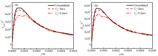 The distribution of the root mean square of and Q values along the normal direction are shown in Figure 15. Both methods identify the same vortex intensity distribution. Comparing the changes before and after injecting microbubbles, the injection of microbubbles leads to the weakening of the vortex intensity. Figure 15 shows that the intensity of the vortex weakens in the vicinity of the peak. The peak position is approximately , which corresponds to the transition zone in Figure 3. The distribution of turbulent fluctuation intensity that appears in Figure 4 has a peak exactly where the peak of fluctuation intensity is located. From the literature [46,47], it can be deduced that this is the position where the burst occurs. In other words, the peak position in Figure 15 is where the burst occurs. Thus, the decrease in the peak value of the vortex intensity after the injection of microbubbles indicates that the appearance of microbubbles may suppress the occurrence of the burst.