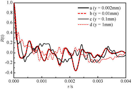 where E indicates an ensemble average of samples. Figure 16 is an autocorrelation of flow velocity at monitoring points in the flow field. The distances between the position of the monitoring points and the wall increases from points a to d. In the figure, the horizontal axis indicates the delay time, and the delay time corresponding to the second peak of is the period of the bursts [46,52,53]. As shown in the figure, the autocorrelation of velocity at points a and b remains the same. A second peak was reached at 0.56 ms, indicating that bursts occur at a period of 0.56 ms. The delay time for at point c to reach the second peak is 0.94 ms. This period of the bursts is longer than that at point b, which means that at some distance from the wall, bursts occur less frequently than near it. Point d is chosen completely randomly, and there is no quasi-periodic phenomenon, which indicates that no bursts occur. It should be noted that a quasi-periodic phenomenon is also detected at point a, and the changes in points a and b are almost identical, but bursts do not occur at point a. One reason why the change at a is identical to that at point b is that so long as bursts occur at point b, a high-speed fluid can impact the wall, and point a is exactly where the high-speed fluid passes. Another reason is that point a is close to the wall and bursts mainly occur in the transition zone. Therefore, a quasi-periodic change can be detected at point a, although no bursts occur there.