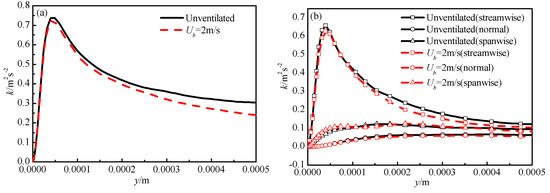 Figure 17a gives a comparison of turbulent kinetic energy as expressed in Equation (29), before and after the injection of microbubbles, which shows the kinetic energy of the fluid fluctuation per unit mass. The figure shows that turbulent energy is reduced after the injection of microbubbles. This is because the source of turbulent energy is the mean flow, and bursts are an important mechanism for the transfer of energy from mean to fluctuating flow. After the streak is destabilized, it oscillates violently, and the fluid in the linear bottom layer is ejected to the logarithmic layer, while the logarithmic layer of fluid is brought to the bottom layer in a high-speed sweep. During this process, a strong fluctuation occurs, and energy is transferred from the mean to the fluctuating flow. The presence of microbubbles suppresses the frequency of bursts in the turbulent boundary layer, which is equivalent to closing the channel through which energy is transferred from the mean to the fluctuating flow. The energy obtained from the fluctuating flow is reduced, resulting in a decrease in kinetic energy. This decrease in energy is reflected in vortex intensity, which results in a decrease in the intensity of the vortex in Figure 15. Figure 17b shows components of turbulent kinetic energy. The reduction in turbulent kinetic energy is mainly provided by streamwise and spanwise components, while the normal components are almost the same. This shows that the presence of microbubbles does not affect normal turbulent kinetic energy.