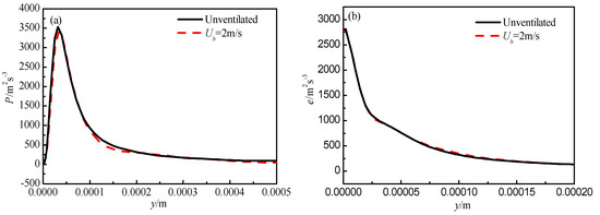 Average distribution of production and dissipation of turbulent kinetic energy along the normal direction: (a) production of turbulent kinetic energy and (b) dissipation of turbulent kinetic energy.