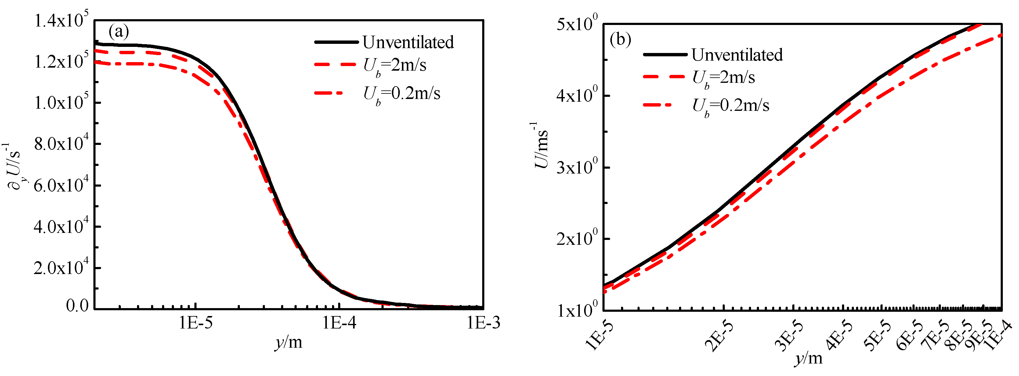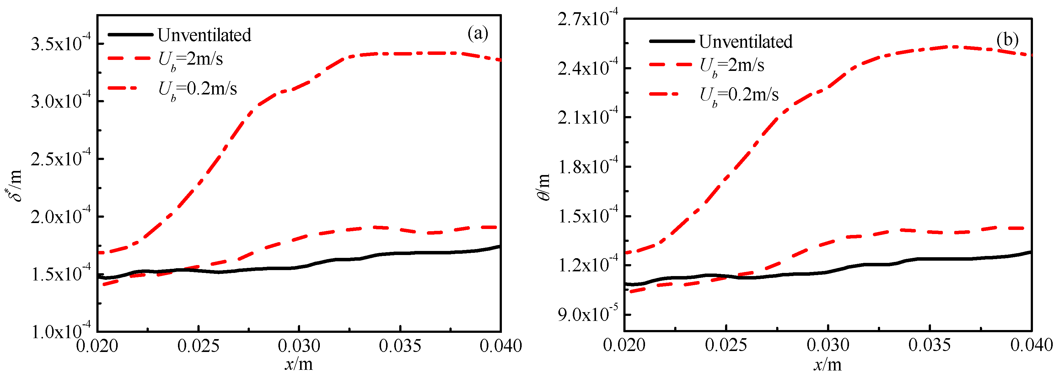 - The velocity gradient at the wall is decreased after the injection of microbubbles. At the same time, the region where the mean velocity promptly changes moves outward after injection. Because of these two changes, a longer distance is required for the velocity in the turbulent boundary layer to reach the inflow velocity. Thus, the displacement thickness and momentum thickness increase and the turbulent boundary layer becomes thicker.