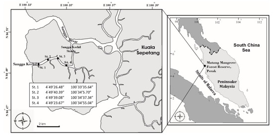 Map showing the locations of four selected sampling sites of the study area in the Sangga Kechil estuarine-mangrove area, Matang, Perak.