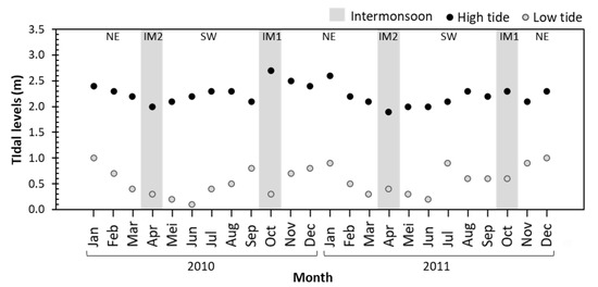 Tidal levels (m) at Sangga Kechil estuarine-mangrove from 2010 to 2011. NE, northeast; SW, southwest; IM1, intermonsoon (transition from dry to wet season); IM2, intermonsoon (transition from wet to dry season).