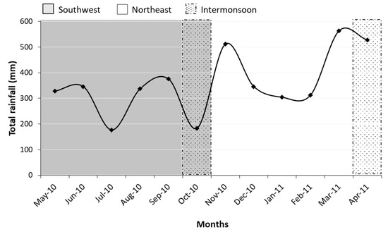 Rainfall data of the study area showing the dry season during the southwest monsoon (May to September) and wet season during the northeast monsoon (November to March) separated by inter-monsoons in October and April.