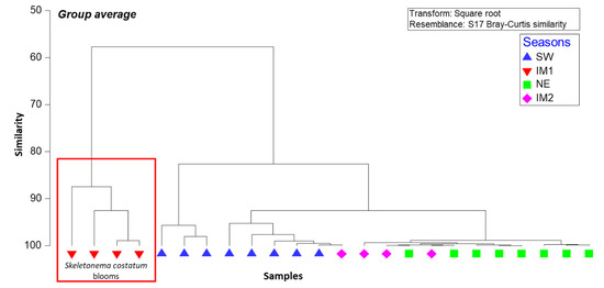 Hierarchical clustering of Shannon–wiener diversity index (H’) using group-average linking 24 phytoplankton samples of Bray Curtis dissimilarities according to seasons. A group of samples during the intermonsoon in October (IM1), separated at 60%, was associated with the massive blooms of Skeletonema costatum.