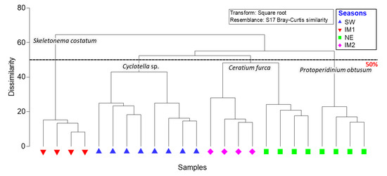 The hierarchical clustering amongst phytoplankton abundance across seasons at 50% dissimilarity showed four groups; each was clearly associated with a specific season (Figure 5). The clustering dendrogram displayed a strong inter-relation with high similarities within groups of similar species in specific seasons. Diatoms formed the highest percentage contributions compared to other phytoplankton groups with the occurrence of Cyclotella sp., and Skeletonema costatum dominating the southwest monsoon and the inter-monsoonal period IM1, respectively (Figure S1). Dinoflagellates became dominant during the late northeast season and the inter-monsoonal period in April (IM2), associated with relatively low temperatures and high total dissolved solids during the wet season (Figure 5 and Figure S1, and Table 1).
