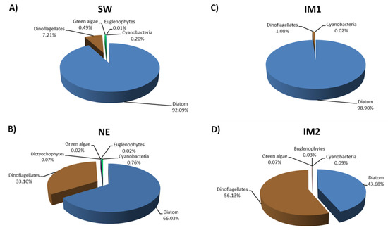 Seasonal contributions of different major phytoplankton groups (mean %) in the Sangga Kechil estuarine-mangrove area during (A) the dry season-SW: southwest monsoon, and (B) wet season–NE, northeast monsoon, and during the transitional intermonsoon periods (C) IM1 (October) and (D) IM2 (April).