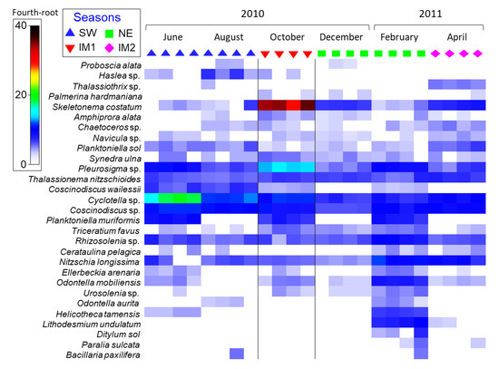 Shade plot, a visual representation abundances of a total of 50 diatom species out of 85 phytoplankton taxa across different stations and different monsoonal seasons with spectrum scale intensity proportional to the fourth-root abundance. The dendrogram shows species clustering using standard agglomerative methods of calculating group average, with white denotes the absence of the species.