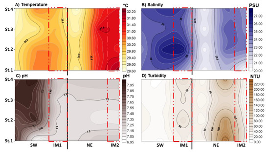 Seasonal changes of (A) temperature, (B) salinity, (C) pH, and (D) turbidity at different sites in the Sangga Kechil estuarine-mangrove area during the study period.