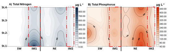 Seasonal changes of nutrients, (A) total nitrogen and (B) total phosphorus at different sites in the Sangga Kechil estuarine-mangrove area during the study period.