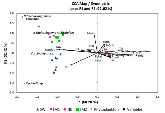 Canonical correspondence analysis (CCA) ordination of major phytoplankton groups and species with physical and chemical parameters in different seasons of the first two axes, F1 = 60.20% and F2 = 32.42%. Only the species well-characterized by the first two CCA components are shown.