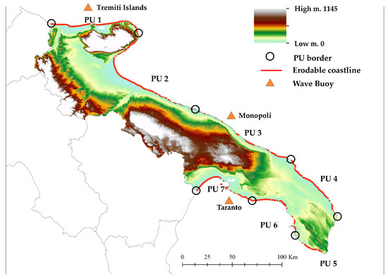 On the regional coastline, seven main Physiographic Units (PU) are identified (Figure 1). Each PU is a very complex environment and several types of coastline can be found: (i) long sandy beaches bordered by coastal dunes (PU1, PU4, PU7), (ii) beach barriers that separate coastal lagoons from the open sea (PU1, PU5), (iii) low-lying areas with long sandy beach (PU2), (iv) pocket beaches (in almost all the PU), (v) sea cliffs and rock coastlines (with or without protective beach) (PU1, PU3, PU5, PU6).