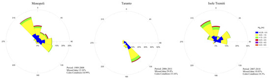 Wave climate analysis is based on data collected offshore Taranto and Tremiti Islands by the Apulia Region Meteomarine Network (http://93.51.158.171/web/simop/home) and offshore Monopoli by the Italian Wave Network (IWN) as reported in Figure 1. The distribution of the percentage frequency of wave direction and height in the selected locations (Figure 2) shows that the wave climate is moderate, characterized by low-medium energy sea states [35,36,37]. While extreme wave storm events are not very frequent, Apulian coasts are subject to considerable phenomena of coastal erosion and flooding, which lead to negative consequences on both natural and anthropic environmental as well as human life.