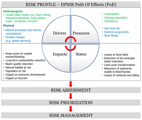 According to the above characterization of Apulian coasts, processes are summarized through the Path of Effects (PoE), defined as a cause-effects chain, where processes are categorized in Drivers, Pressures and the corresponding States and Impacts (e.g., [23]). Figure 3 shows the path of risk flow chart developed for the presented case of study. Since differences in terminology and definitions in the DPSIR model could lead to a misunderstanding and ambiguities in the interpretation of results (e.g., [12,16,50]), a declaration of the adopted terms is required. In the present work, a risk profile is drawn by starting from the identification of the main drivers of erosion and flooding hazards typically considered in coastal risk assessment. Two main groups of drivers are defined (considered relevant) for the hazard characterization. The first group (anthropogenic) involves basic human needs-related drivers occurring with social and economic development. Human activities and policies aimed at satisfying such needs lead human-induced pressures on the coastal environment. The second group includes physical drivers exerted by natural phenomena, combining sea storms and meteorological events (e.g., precipitation) with climate change. The latter, even if actually derived from long-term effects of human existence, are here recognized as exogenous drivers, as they increase the magnitude and frequency of coastal storms, extreme discharges and considered as the main cause of sea level rise.