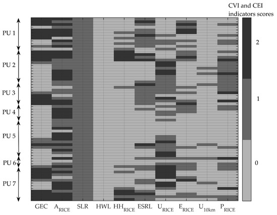The quantification of the CVI and CEI indicators is performed for all coastal regional municipalities. Both vulnerability and exposure indexes are represented through a color map (Figure 4) that easily allows identifying causes and impacts on the regional coastline at the municipality scale. With respect to Figure 4, it can be seen that the highest scores in GEC and ESRL indicators are present in PU1, PU2, PU3 and PU7, where the greater concentration of population ( and can be seen in PU2 and PU3. The indicator reaches the high or medium score in almost all the municipalities, while the highest scores in can be found in PU2 and PU7.
